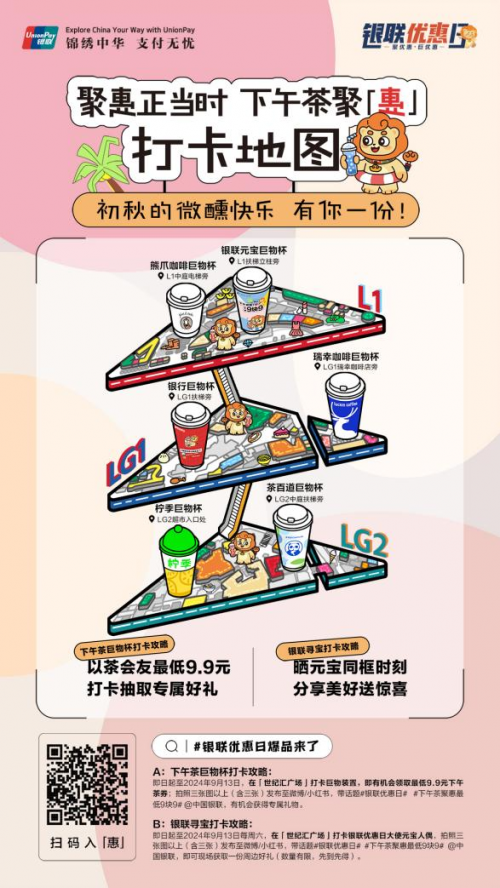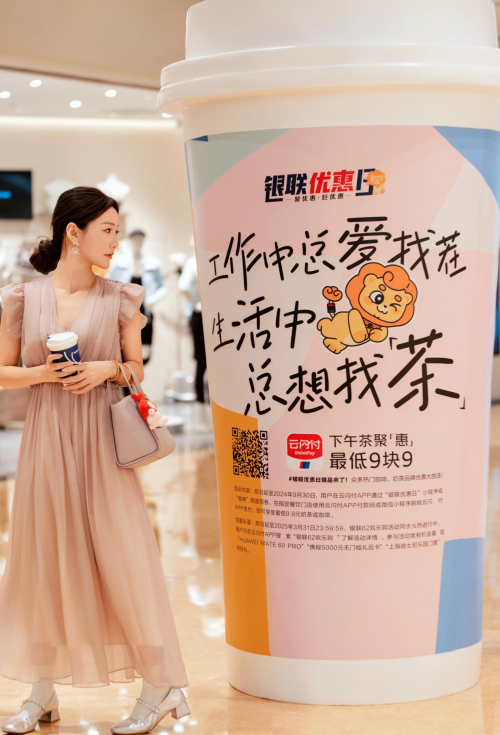 活動期間,消費者在世紀大道地鐵站11號出口處電子屏獲取具體活動信息。世紀匯廣場L1、LG1、LG2樓層均布置有主題巨物奶茶裝置,消費者參與打卡即有機會領取最低9.9元下午茶券;同時,拍照發(fā)布至微博/小紅書,帶話題#銀聯(lián)優(yōu)惠日# #下午茶聚惠最低9塊9# @中國銀聯(lián),還可獲取專屬禮物抽獎機會。值得一提的是,活動期每周六,消費者還可在世紀匯廣場打卡銀聯(lián)優(yōu)惠日優(yōu)惠大使元寶人偶,參與互動即可現(xiàn)場獲取一份周邊好禮(數(shù)量有限,先到先得)。