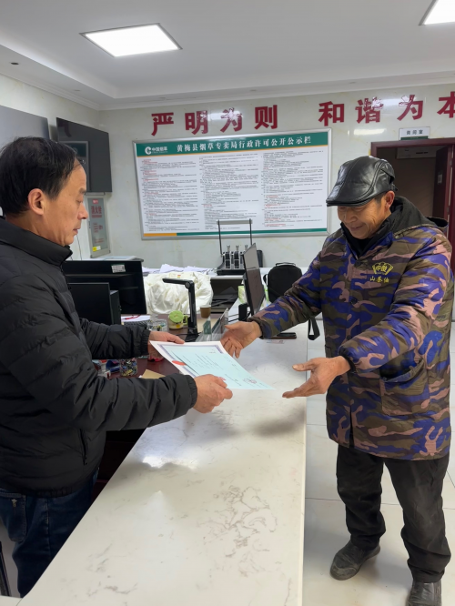 圖為:黃梅縣煙草專賣局辦證人員向零售戶送達(dá)煙草證 王振宇攝
