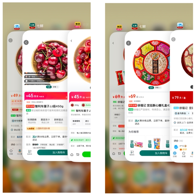 各式水果和甜品讓新的一年先甜起來。京東七鮮智利車?yán)遄覬J級色澤誘人,可口多汁,450克秒殺價45.8元,盒馬同款同規(guī)格車?yán)遄右u到49.9元。徐福記宮廷酥心糖禮盒,京東旗七鮮售價69元,盒馬售價79.9元,比京東七鮮高了16%。