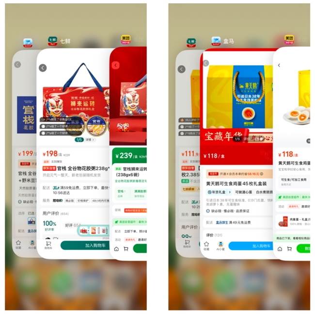 節(jié)日探親訪友,看望老人,京東七鮮準(zhǔn)備了豐富的既實惠、又有“排面”的年貨禮盒。官棧獅來運轉(zhuǎn)全谷物花膠粥禮盒,采用天然全谷物配方,含有天然膠原蛋白,營養(yǎng)豐富0添加,無論是關(guān)愛長輩還是商務(wù)送禮都很合適。京東七鮮售價198元,美團小象售價239元,高了41元,約20%。黃天鵝可生食雞蛋45枚禮盒裝,引進日本38年可生食雞蛋標(biāo)準(zhǔn),更安全、更好吃、更營養(yǎng)。京東七鮮售價111.9元,美團小象和盒馬都要賣到118元。