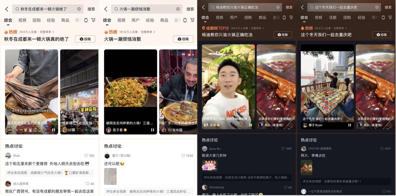 【抖音生活火鍋季】還打造了#秋冬在成都來(lái)一頓火鍋絕了、#火鍋一涮煩惱消散、#楊迪教你川渝火鍋正確吃法、#這個(gè)冬天我們一起去重慶吧 多個(gè)火鍋話題熱點(diǎn),持續(xù)引爆活動(dòng)氛圍,累計(jì)收獲1.1億曝光,話題下的短視頻內(nèi)容更是給商家?guī)?lái)429萬(wàn)的GMV增長(zhǎng)。