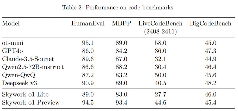 全面升級且正式上線的Skywork o1 Lite / Skywork o1 Preview大幅提升了數學、代碼和邏輯推理能力。我們對其進行標準數學基準測試(包括GSM8k、MATH、OlympiadBench、AIME-24以及AMC-23),以及在HumanEval、MBPP、LiveCodeBench及BigCodeBench這四項代碼基準測試上評估了Skywork o1的代碼能力。