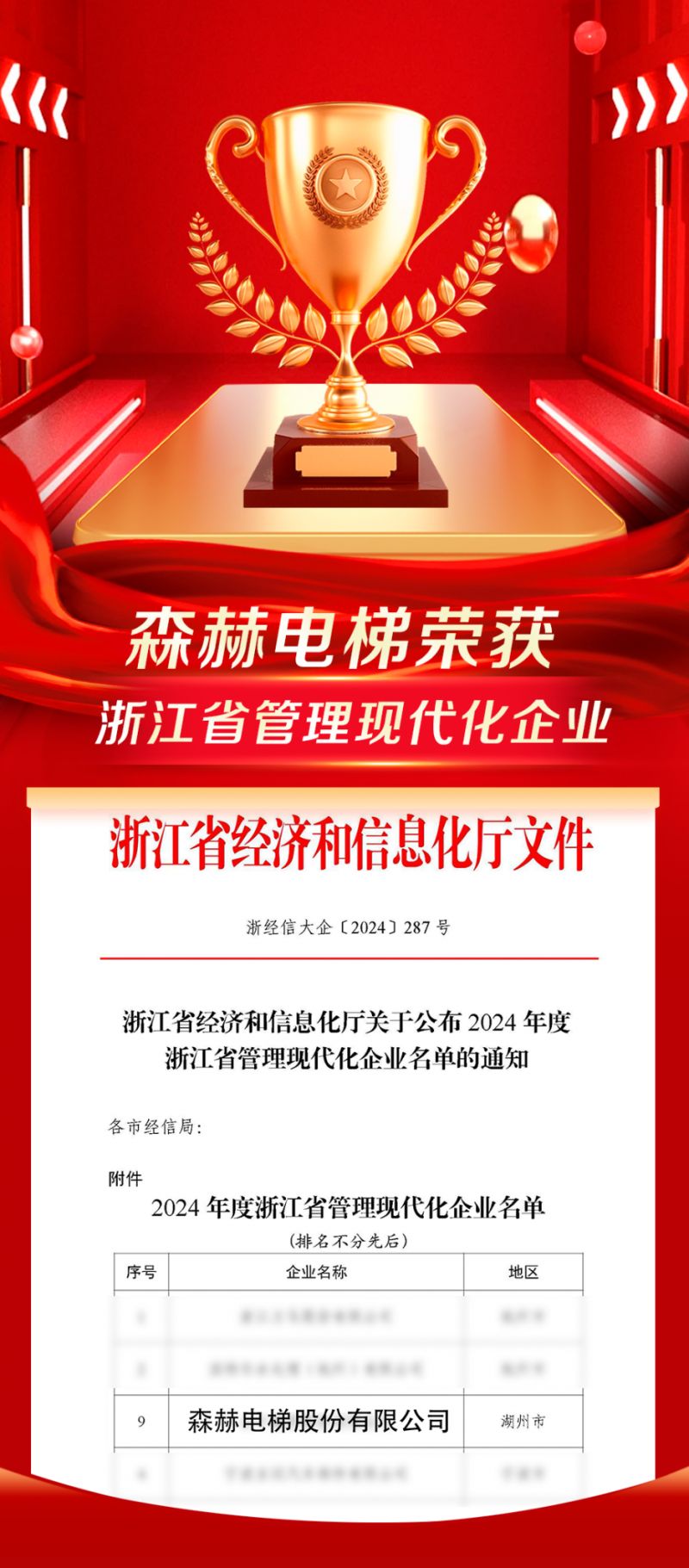 浙江省經濟和信息化廳公布2024年度浙江省管理現(xiàn)代化企業(yè)名單的通知,森赫電梯榮耀登榜,成為20家企業(yè)中唯一一家電梯企業(yè)。