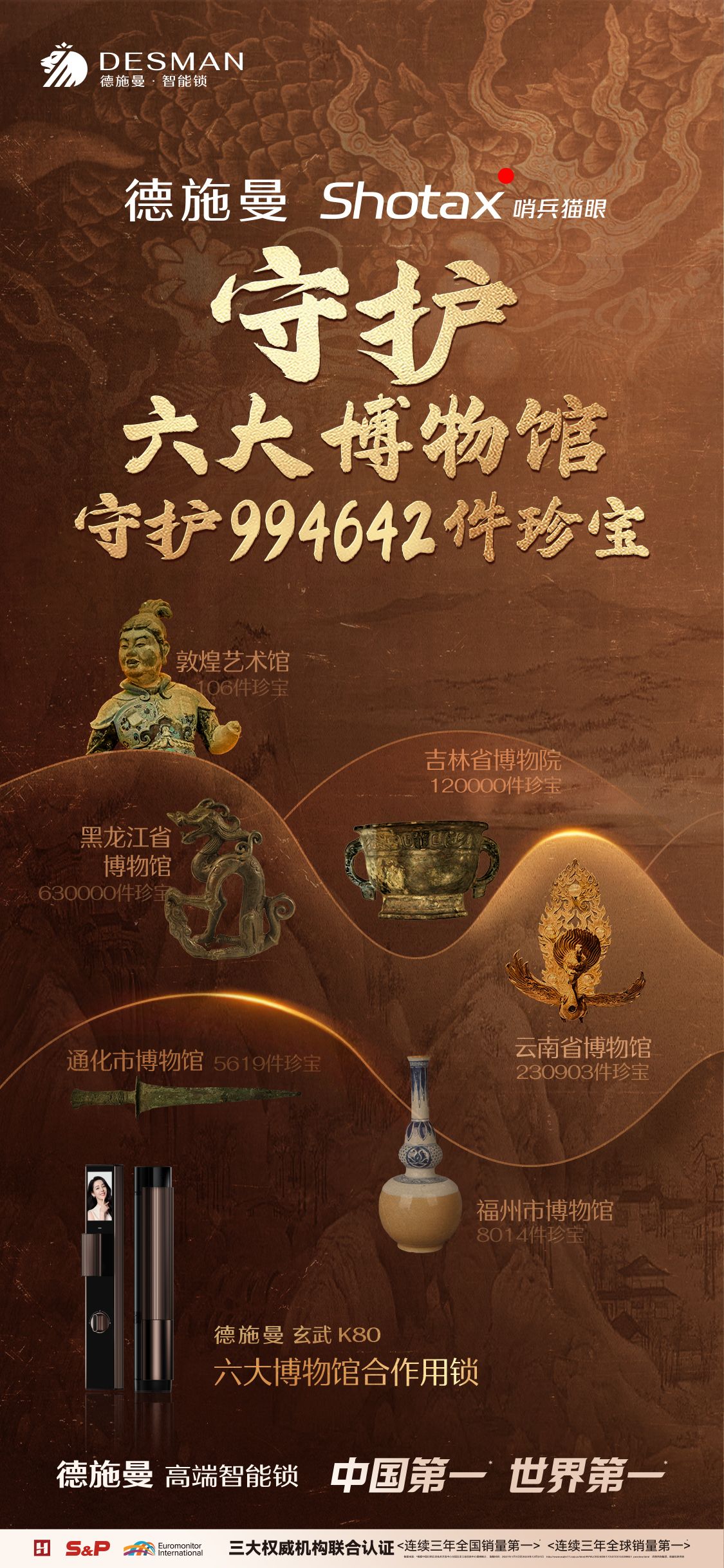 以科技之名傳承歷史,以創(chuàng)新之力鏈接未來。此前,智能鎖領(lǐng)軍品牌德施曼與國內(nèi)六大知名博物館,共同啟動了“珍寶守護計劃”;如今,“珍寶守護計劃”歷經(jīng)敦煌藝術(shù)館、吉林省博物院、黑龍江省博物館、云南省博物館、通化市博物館以及福州市博物館,迎來圓滿收官。德施曼Shotax哨兵貓眼,守護六大博物館,守護994642件珍寶,以科技串聯(lián)古今,為傳統(tǒng)文化傳承注入了科技創(chuàng)新之力。
