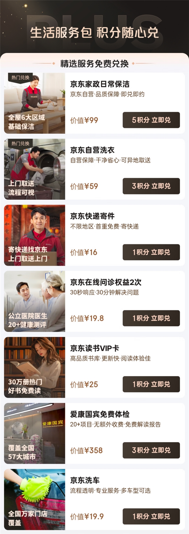 新年伊始,京東PLUS會員權(quán)益全面升級。首先,京東PLUS會員整合原有的多項生活服務(wù)權(quán)益,全新推出“生活服務(wù)包”,京東PLUS新會員開年卡即可獲得12積分,按需免費兌換“生活服務(wù)包”里的相關(guān)權(quán)益,包含家政保潔、洗衣洗鞋、標準洗車、免費寄快遞、免費問診、讀書VIP月卡、免費體檢7大特權(quán)。比如,京東PLUS會員用3積分可以免費兌換一次價值358元的體檢服務(wù),5積分可以免費兌換一次價值99元的家政保潔服務(wù)。京東PLUS老會員則可按照會員剩余天數(shù)獲得相應(yīng)比例的積分,隨心兌換相關(guān)權(quán)益。