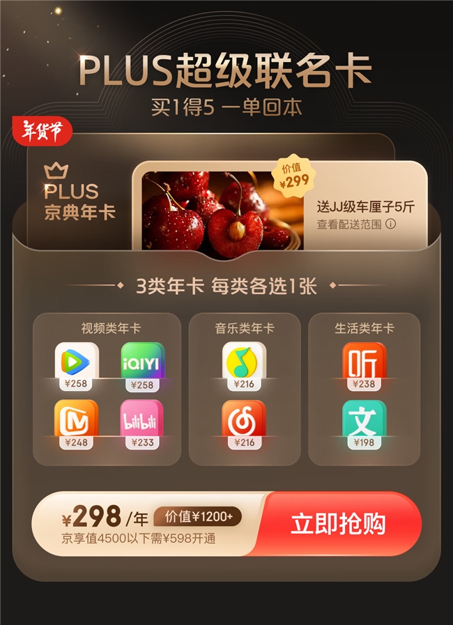 在1月8日京東PLUS會員權(quán)益重磅升級之際,京東PLUS年度盛典活動也正式開啟。在此次PLUS年度盛典上,京東PLUS會員聯(lián)合騰訊視頻、網(wǎng)易云音樂等熱門品牌推出超級聯(lián)名卡,于1月8日早上10點正式開售。用戶只需298元即可搶購總價值超1200元的超級聯(lián)名卡,其中包含1張京東PLUS會員京典卡、價值299元的5斤JJ車厘子,以及騰訊視頻、愛奇藝、B站、芒果TV視頻會員年卡任選其一,網(wǎng)易云音樂、QQ音樂音頻會員年卡任選其一,百度文庫、喜馬拉雅生活會員年卡任選其一,一張卡即可全方位滿足用戶購物、追劇、聽歌等需求。
