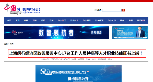 中國網(wǎng)數(shù)字經(jīng)濟(jì)官方報(bào)道:上海閔行經(jīng)濟(jì)區(qū)政務(wù)服務(wù)中心17名工作人員持高等人才職業(yè)技能證書上崗!