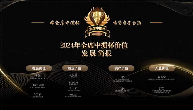 由全席中摜杯商圈錦標(biāo)賽組委會(huì)、全席名人堂、中摜杯國(guó)際文化傳媒(北京)有限公司共同主辦的2024全席中摜杯商圈總決賽在北京國(guó)家網(wǎng)球中心閉幕。閉幕式現(xiàn)場(chǎng)舉行了頒獎(jiǎng)儀式、頒獎(jiǎng)晚宴,同時(shí)發(fā)布了摜牌經(jīng)濟(jì)價(jià)值評(píng)估標(biāo)準(zhǔn)、全席名人堂文體IP構(gòu)建標(biāo)準(zhǔn)、文體商圈等六項(xiàng)文體經(jīng)濟(jì)專項(xiàng)價(jià)值標(biāo)準(zhǔn)。