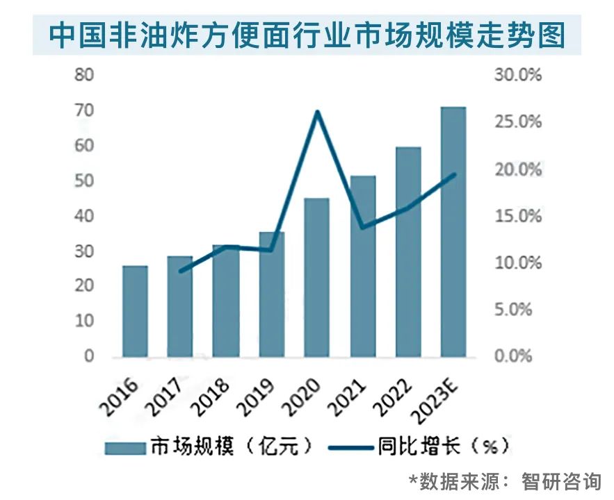 最近這些年,健康化成為了大眾飲食的一大趨勢。在這一趨勢下,“非油炸方便面”成為新一輪風(fēng)口。據(jù)智研咨詢報告數(shù)據(jù)顯示,非油炸方便面在過去幾年的市場規(guī)模增速超過了10%,預(yù)計未來將繼續(xù)維持在這一增速水平,成為方便面行業(yè)中的“新藍(lán)?!?。