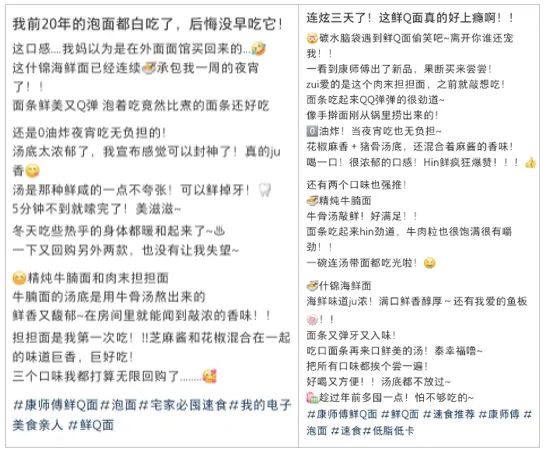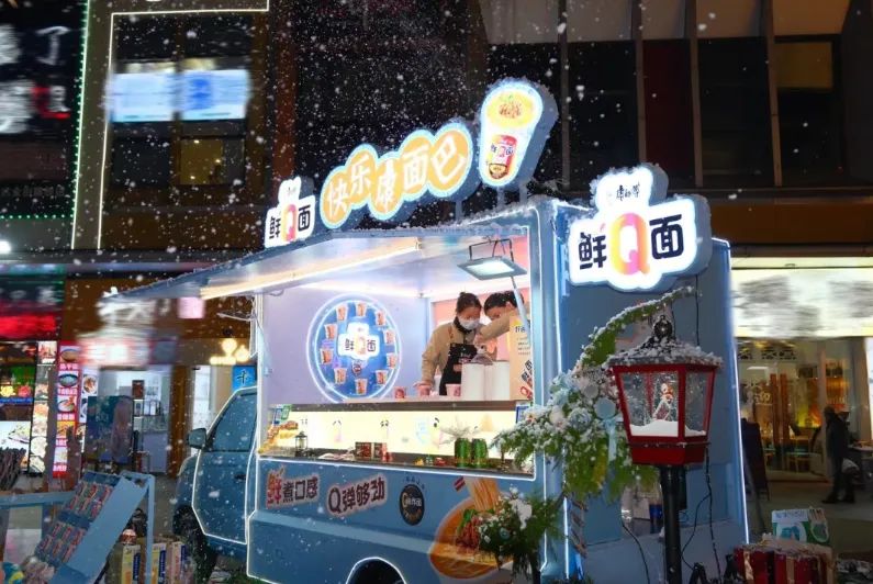 線下,康師傅的品牌推廣車“快樂康面巴”是一大亮點,推廣車這種形式流動性好,更有利于實現(xiàn)人群和場景的觸達(dá)。寒冬時節(jié),這輛車出現(xiàn)在商場、集市、游樂場等年輕人聚集地,被吸引而來的年輕消費者前來體驗鮮Q面的美味,很多人第一時間在社媒打卡、分享、反饋?!案F(xiàn)煮的口感一樣”、“吸滿了湯汁好入味”、“在冬日里吃到冒著熱氣的‘鮮Q面’”……大家好評不斷,溫馨幸福的氛圍直接拉滿,“鮮Q口感,宛如現(xiàn)煮”的認(rèn)知也悄然在消費者中形成和擴(kuò)散。