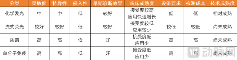 化學(xué)發(fā)光在成本、裝機量上有領(lǐng)先優(yōu)勢,但靈敏度不滿足早篩要求?;瘜W(xué)發(fā)光技術(shù)發(fā)展成熟,自動化程度高,設(shè)備普及度高,檢測時間快,獲批上市的產(chǎn)品也多,價格透明,檢測靈敏度在皮克級,可以達到臨床診斷的要求。但是,化學(xué)發(fā)光的靈敏度暫時不能滿足早篩的要求,化學(xué)發(fā)光只能檢測血液中含量相對較高的標志物,而早期無癥狀患者血液內(nèi)的標志物含量極低,不適用于早篩。因此,憑借裝機量、成本優(yōu)勢,化學(xué)發(fā)光更適合用于門診,對已有癥狀的患者進行臨床診斷。