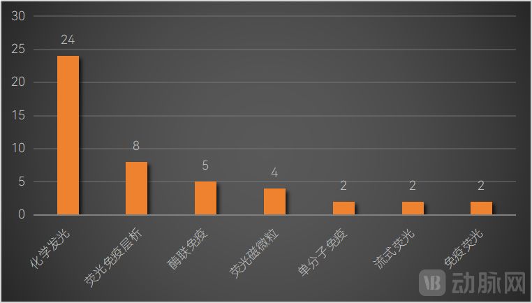 獲批的AD血液檢測試劑盒中,采用化學(xué)發(fā)光技術(shù)的最多,有24款,采用酶聯(lián)免疫技術(shù)的有5款,采用單分子免疫技術(shù)和流式熒光技術(shù)的分別有2款。暫時沒有基于質(zhì)譜法的血液檢測試劑盒獲批。