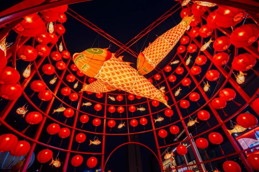 ? 滁州天長吾悅廣場以“紅韻悅夢”為主題,將火紅的燈籠和非遺魚燈相結(jié)合,以游園燈會、魚燈巡游等形式,打造極富徽州傳統(tǒng)文化韻味的新春場景。