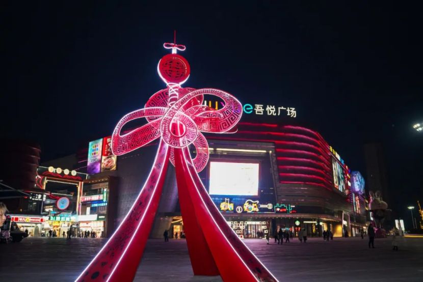 ? 淮南吾悅廣場以象征著團(tuán)結(jié)、幸福和平安的中國結(jié)為原型打造大型藝術(shù)裝置,呈現(xiàn)別樣的東方美學(xué)。