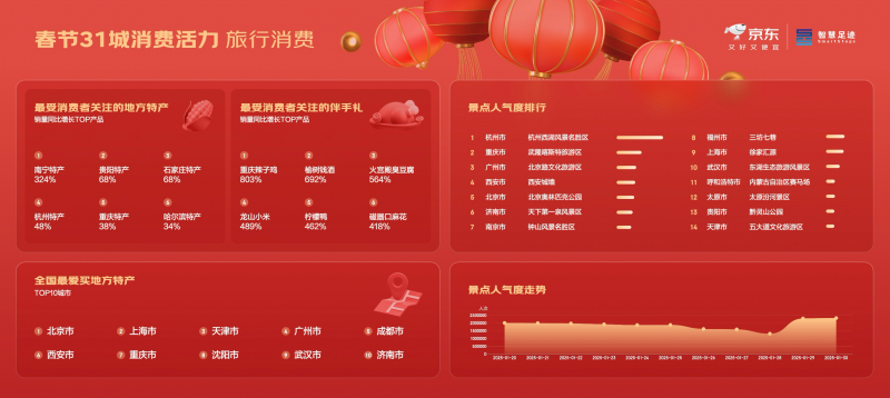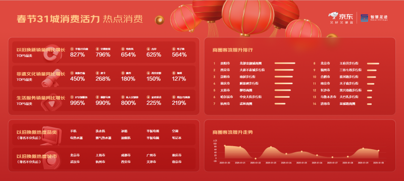 乙巳年春節(jié)假期,消費(fèi)市場(chǎng)持續(xù)火熱,線下商圈通過特色場(chǎng)景化消費(fèi)、生活?yuàn)蕵废M(fèi)以及文化體驗(yàn)消費(fèi),吸引了大量消費(fèi)者,展現(xiàn)了春節(jié)消費(fèi)的多樣性與活力。京東聯(lián)合聯(lián)通數(shù)智智慧足跡,對(duì)全國(guó)31個(gè)城市的線下商圈客流量及消費(fèi)數(shù)據(jù)進(jìn)行了實(shí)時(shí)動(dòng)態(tài)統(tǒng)計(jì),反映出消費(fèi)者在春節(jié)線上線下各場(chǎng)景中的消費(fèi)趨勢(shì)。