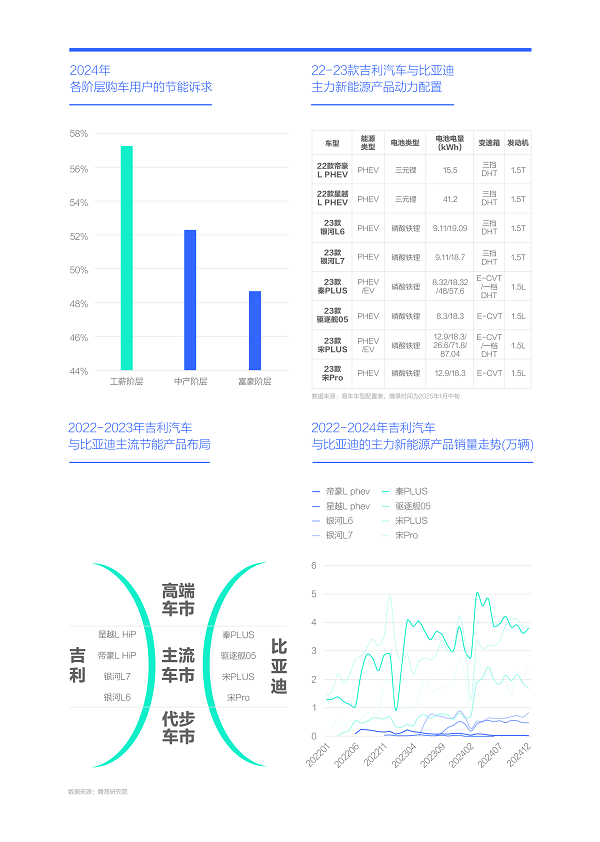 2021年起比亞迪之所以能快速崛起并強勢擠壓吉利汽車,主要受惠于聚焦工薪車市的秦PLUS、宋pro、宋PLUS等節(jié)能型產(chǎn)品。對比中產(chǎn)與富豪,工薪用戶的節(jié)能訴求最強烈,2024年高達57.26%。2021年吉利主銷產(chǎn)品也高度聚焦工薪車市,但燃油車占比95%以上,節(jié)能性遠不如PHEV、EV等新能源產(chǎn)品,導致吉利汽車在與比亞迪的競爭中,快速失去“民心”;