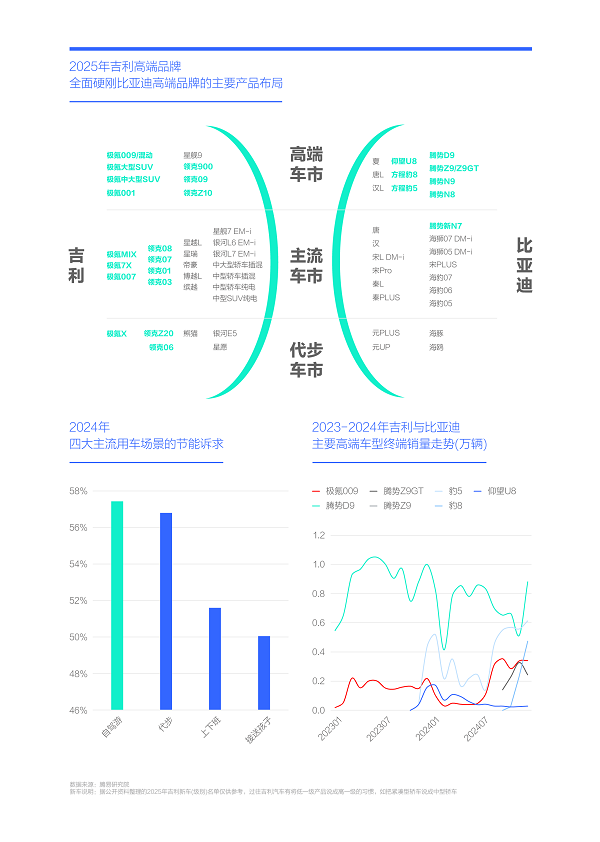 無論吉利還是比亞迪,本輪高端攻勢都主打節(jié)能大車,便于滿足高端家庭的自駕游訴求。從用車場景的節(jié)能訴求看,自駕游最高,2024年近58%,將為節(jié)能大車提供廣闊舞臺。由于吉利和比亞迪在高端車市都處發(fā)力初期且力度空前,兩者的全面“硬剛”,將為中國高端車市帶去更多變數(shù)。