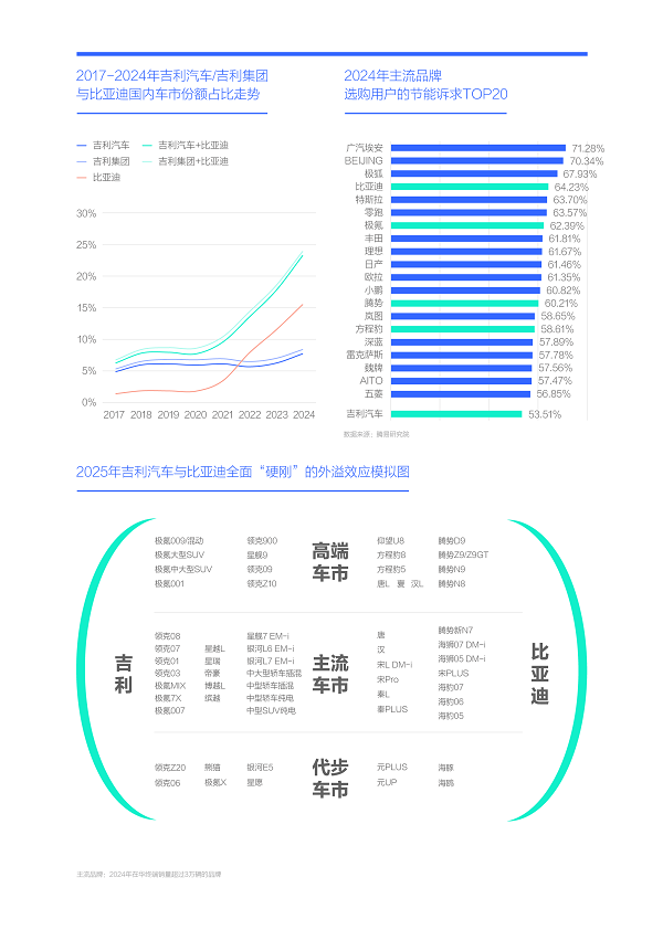 圍繞節(jié)能產(chǎn)品,如果說吉利汽車與比亞迪的全面“硬剛”是向中國車市投入一枚核彈,那向中國品牌陣營就是投入兩枚核彈:2024年吉利汽車+比亞迪占了中國乘用車大盤近25%的份額,占了中國品牌近40%的份額;2024年中國車市的新能源滲透率逼近50%,中國品牌的新能源滲透率逼近70%……2025年如競品的節(jié)能與定價能跟上吉利與比亞迪的節(jié)奏,2025-2026年大體還能留在牌桌上,如跟不上節(jié)奏,大概率會被加速淘汰。那些中小型中國品牌除了積極合作華為,更要努力優(yōu)化節(jié)能與定價,因為就汽車而言,節(jié)能更能搶占用戶的消費心智,且節(jié)能不是華為的優(yōu)勢;