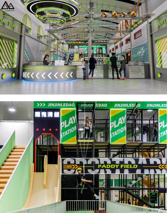 蹦床公園:拆除舊倉庫部分墻體,打造高挑空蹦床館,增強互動娛樂感。