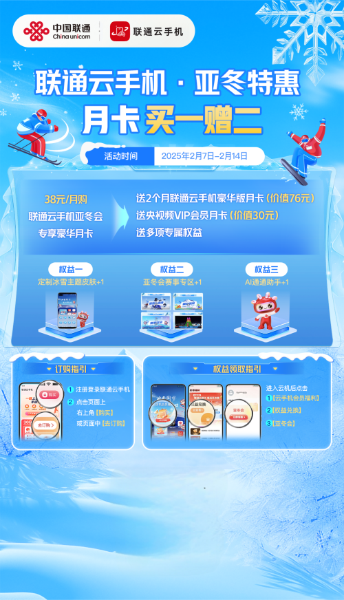 現(xiàn)在起購(gòu)買(mǎi)聯(lián)通云手機(jī)亞冬會(huì)專(zhuān)享豪華月卡(38元/月),即贈(zèng)送2個(gè)月豪華版月卡(價(jià)值76元)+央視頻VIP月卡(價(jià)值30元)+AI不限量特權(quán),同時(shí)還能享受多項(xiàng)專(zhuān)屬權(quán)益,包括定制冰雪主題皮膚、亞冬會(huì)賽事專(zhuān)區(qū)訪問(wèn)權(quán)限以及AI通通助手服務(wù)。