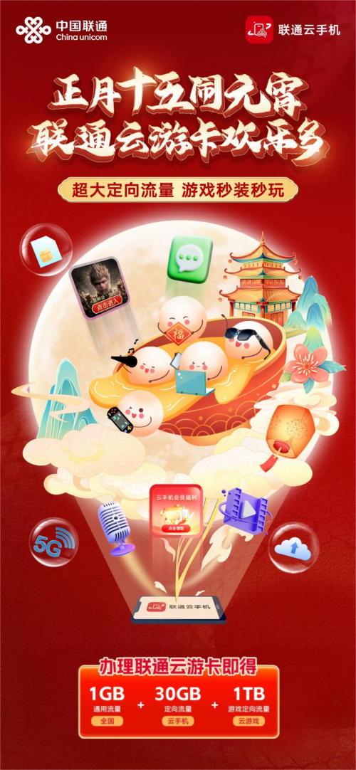 聯(lián)通云游卡攜元宵專(zhuān)屬驚喜登場(chǎng)。辦理即得1GB全國(guó)通用流量、30GB云手機(jī)定向流量和1TB云游戲定向流量。暢享超大定向流量,游戲秒裝秒玩,擺脫卡頓束縛。這個(gè)元宵,讓聯(lián)通云游卡陪你盡情嗨玩,掃描海報(bào)二維碼速辦,開(kāi)啟暢爽云游之旅!