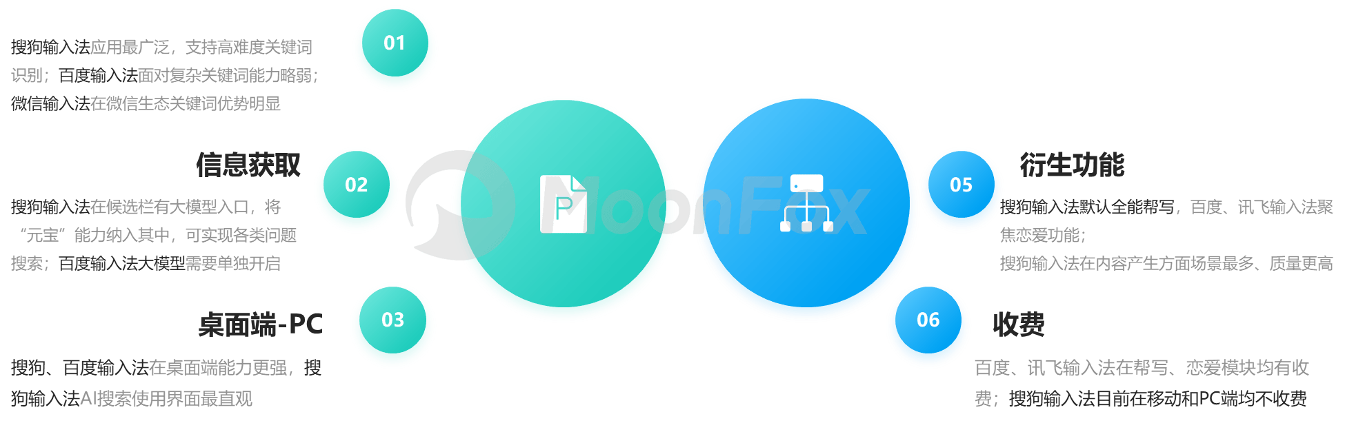 頭部輸入法產(chǎn)品在AI搜索方面投入較多,其中搜狗輸入法在各方面均占據(jù)優(yōu)勢,移動端和PC均設(shè)置最便捷AI搜索入口,同時關(guān)注多場景、個性化功能,從搜索開始到具體場景應(yīng)用均有覆蓋,產(chǎn)品具備新型工具和助手型產(chǎn)品雙重優(yōu)勢。