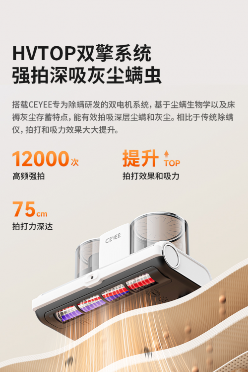 希亦除螨儀之所以能夠在眾多同類產(chǎn)品中脫穎而出,得益于其搭載的6大硬核黑科技。從高頻拍打到超聲波滲透,再到UV-C殺菌、負(fù)壓吸附、熱風(fēng)干燥以及深層凈濾技術(shù),這六大技術(shù)協(xié)同作戰(zhàn),共同構(gòu)建了一個(gè)全方位、深層次的除螨體系。在高頻拍打的作用下,塵螨被有效拍打下來(lái),隨后被強(qiáng)大的吸力所吸走。超聲波滲透技術(shù)則能夠深入織物纖維,瓦解螨蟲(chóng)倒鉤抓力,實(shí)現(xiàn)更深層次的清潔;而UV-C殺菌與熱風(fēng)干燥技術(shù),則進(jìn)一步確保了除螨效果的徹底性,讓家居環(huán)境更加健康、安全。