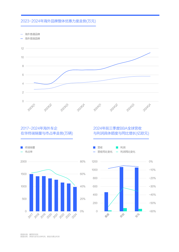 品牌力的提升可以讓車企喜笑顏開,品牌力的下滑可以讓車企愁眉緊鎖。近四五年,隨著海外車企品牌力的大幅下滑,一系列負面現(xiàn)象快速浮出水面:海外車企的終端優(yōu)惠持續(xù)擴大,2023-2024年尤其顯著,2024年底海外普通品牌的每輛終端優(yōu)惠力度逼近6萬元,海外高端品牌超過10萬元。如此恐怖的降價促銷,使得官方價格體系形同虛設,經銷商自然會首當其沖;比亞迪、吉利等不少中國品牌通過價格戰(zhàn),往往能快速提升銷量,但海外車企的大規(guī)模降價促銷,不但沒帶來銷量的快速提升,倒反陷入了進一步下滑,2017-2024年,海外車企的在華終端銷量由1500萬輛跌進1000萬輛,市占率由60-70%跌至40%多點;