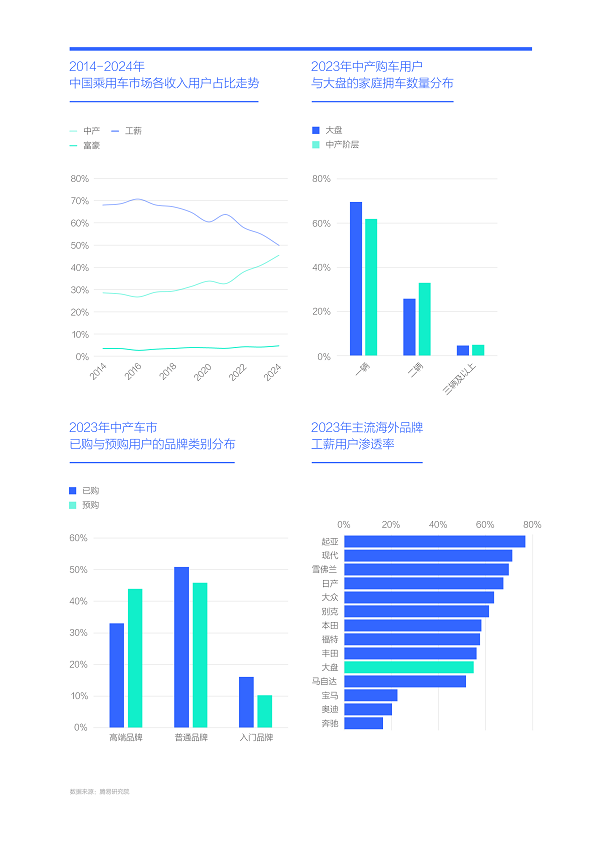 對比工薪,中產用戶有自己鮮明的購車特征:中產的家庭擁車數(shù)由一輛車向兩輛及以上的多車時代挺進,不僅要解決老公的用車需求,還要解決老婆的用車需求,甚至是孩子或老人等;中產家庭選購高端品牌的意愿更強烈,2023年中產已購車型的高端品牌占比突破30%,預購占比逼近45%;