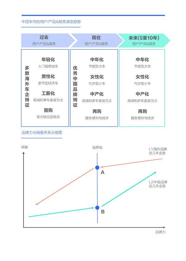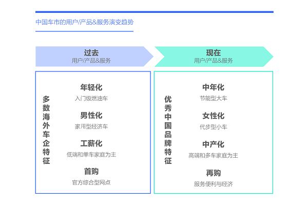 通過前四頁的論證,我們提煉了中國車市用戶演變層面的中年化、女性化、中產化與存量化等幾大新趨勢,并發(fā)現(xiàn)該趨勢正助推中國車市的節(jié)能型大車、代步型小車、高端品牌、便利與經濟性服務網(wǎng)點等的發(fā)展。但海外車企的現(xiàn)行理念與布局嚴重滯后于中國購車用戶結構與需求的演變趨勢,其仍心心念念年輕用戶和首購用戶,且客觀存在大男子主義和工薪用戶占比過高等挑戰(zhàn),導致了海外車企的產品與服務仍局限于入門級燃油車、家庭型經濟車、綜合性網(wǎng)點等;