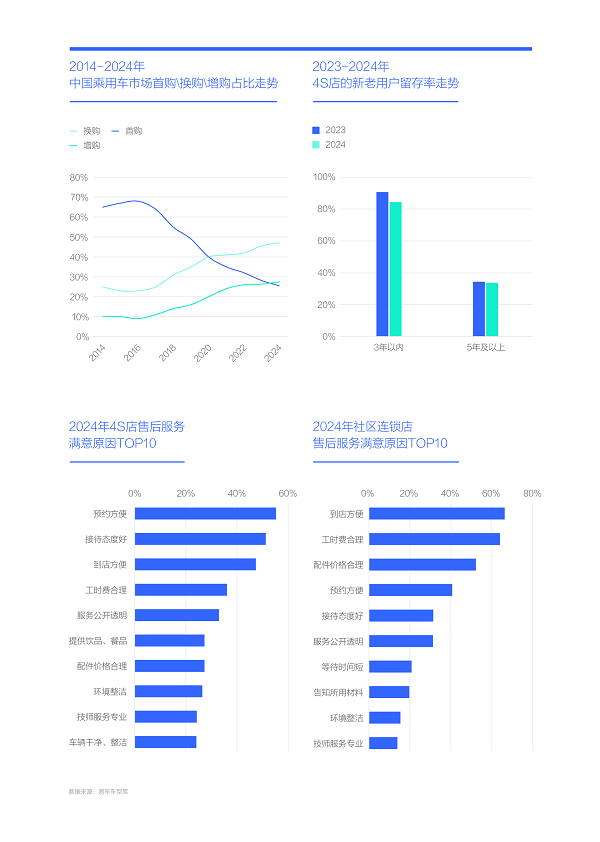 隨著消費意識的越來越成熟,中國購車用戶對維修保養(yǎng)的便利性、經濟性等越來越關注,導致4S店的老用戶留存率大幅降低。2023-2024年,4S店老用戶與新用戶的留存率都在減少,其中擁車5年及以上老用戶的留存率跌破35%;