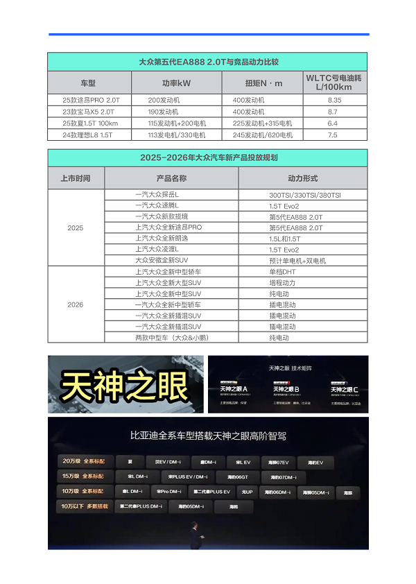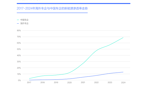 在非常關鍵的電氣化賽道,中國車企與海外車企的差距不但沒有縮小,反而在持續(xù)擴大:2017-2024年,中國車企的新能源滲透率持續(xù)提升,并逼近70%的高位,海外車企的整體新能源滲透率僅有13%,多數(shù)海外車企仍以燃油車絕對為主;2025年初大眾不遺余力推廣的EA888發(fā)動機,雖然對比同級別燃油車動力,的確有很大提升,但對比同級別車型搭載的電氣化動力,扭矩、功率與能耗等核心指標幾乎都不占優(yōu);2025-2026年大眾等主流海外車企雖然也在加速布局新能源產品,但力度與進度都遠遠落后于中國車企,繼2022年比亞迪全面轉型為新能源車企后,2025-2026年將有更多的主流中國車企也會紛紛轉型為新能源車企;