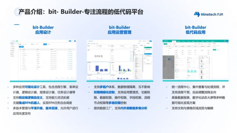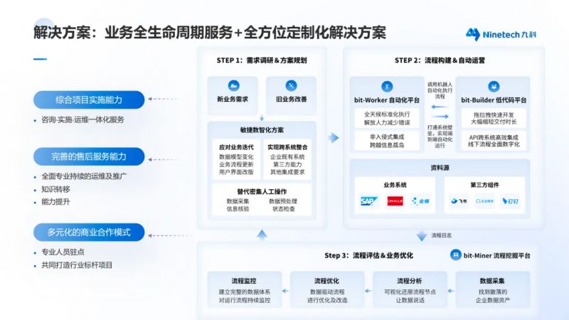 簡單地來說,九科信息的綜合性解決方案結合了云原生技術、RPA+AI、低代碼以及流程挖掘技術。