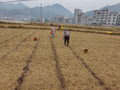 圖為煙農(nóng)在拉線施底肥。謝德軒 攝