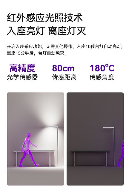 用戶的使用體驗(yàn)也是書客研究創(chuàng)新的重點(diǎn),為了提升使用便捷性,書客 Sun Pro 增加了免觸控智能操控功能,只需一句簡(jiǎn)單的呼喚“小書”,即可輕松掌控光源,支持語音控制開關(guān)燈,無需手動(dòng)操作,暢享智能化照明新體驗(yàn),實(shí)現(xiàn)人來燈亮自動(dòng)化智能場(chǎng)景。不僅如此,紅外感應(yīng)光照技術(shù)進(jìn)一步升級(jí),配備高精度光學(xué)傳感器,感應(yīng)距離達(dá) 80cm,180° 廣角精準(zhǔn)感應(yīng)。開啟入座感應(yīng)功能后,用戶只需入座 10 秒,臺(tái)燈便會(huì)自動(dòng)亮起;離座 15 分鐘后,燈光自動(dòng)熄滅,無需擔(dān)心因匆忙離開而忘記關(guān)燈,智能更節(jié)能。