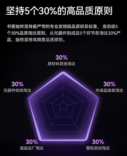 Suker書客秉承旗艦級(jí)品質(zhì)標(biāo)準(zhǔn),依托大型項(xiàng)目研發(fā)與生產(chǎn)經(jīng)驗(yàn),嚴(yán)格打造全流程生產(chǎn)、檢測(cè)與品控體系。光品質(zhì)檢測(cè)涵蓋50余項(xiàng)標(biāo)準(zhǔn),遠(yuǎn)超行業(yè)普遍的5-10項(xiàng)檢測(cè)范圍。同時(shí),書客堅(jiān)持發(fā)燒級(jí)嚴(yán)苛品質(zhì)標(biāo)準(zhǔn),執(zhí)行“5個(gè)30%”高精度品質(zhì)淘汰原則——從元器件到成品的五大關(guān)鍵環(huán)節(jié),逐級(jí)篩選淘汰30%產(chǎn)品,確保最終成品達(dá)到卓越的品質(zhì)水準(zhǔn),真正做到精益求精。