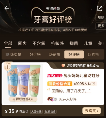 本次獲評的兔頭媽媽高純奧拉氟防蛀牙膏,其核心成分便是自研高純奧拉氟。憑借成分升級,產(chǎn)品可實現(xiàn)兒童牙釉質(zhì)在28天內(nèi)硬度提升42.96%、抑菌率達99.9%、抗酸蝕能力提升65.8%,并擁有12小時長效防蛀認證。此外,兔頭媽媽在產(chǎn)品開發(fā)中始終堅持不變,放在首位的是產(chǎn)品的安全性,旗下牙膏系列均不含香精、防腐劑及風(fēng)險甜味劑,并通過天然果味提取的方式在安全前提下豐富兒童護齒體驗。