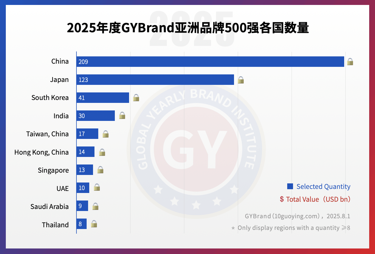 8月1日,GYBrand全球品牌研究院獨(dú)家編制的2025年度亞洲品牌500強(qiáng)排行榜正式發(fā)布。這是一份全面展示亞洲各行業(yè)龍頭企業(yè)品牌建設(shè)最新成果的榜單,主要評(píng)估依據(jù)是品牌價(jià)值,并不是簡(jiǎn)單按照企業(yè)市值或營(yíng)收規(guī)模排序,而是從財(cái)務(wù)業(yè)績(jī)、品牌強(qiáng)度、品牌貢獻(xiàn)、可持續(xù)性等多個(gè)維度進(jìn)行綜合分析。來(lái)自16個(gè)國(guó)家及地區(qū)的500家企業(yè)入選今年的亞洲品牌500強(qiáng)名單,中日韓合計(jì)404家企業(yè)入選,占了總榜單的80.8%。