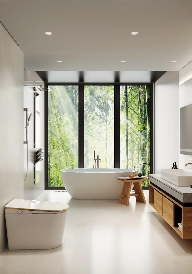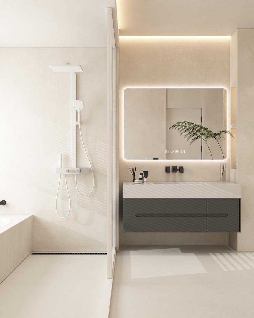 微水泥的運用則是水愛衛(wèi)浴對“無縫空間哲學”的最佳詮釋。這種可實現(xiàn)墻地一體的特殊材質(zhì),在水愛系列產(chǎn)品中經(jīng)過改良升級,不僅具備A級防火性能,更通過添加抗菌成分達到99%的抑菌率。在獨立浴缸區(qū)的設計中,微水泥從墻面延伸至浴缸邊緣,形成流暢的曲面過渡,配合隱藏式排水系統(tǒng),讓空間線條極簡到極致。當燈光透過智能除霧鏡漫反射在微水泥表面,粗糙與細膩、冷硬與柔和的對比,賦予浴室一種美術(shù)館般的沉靜氣質(zhì)。