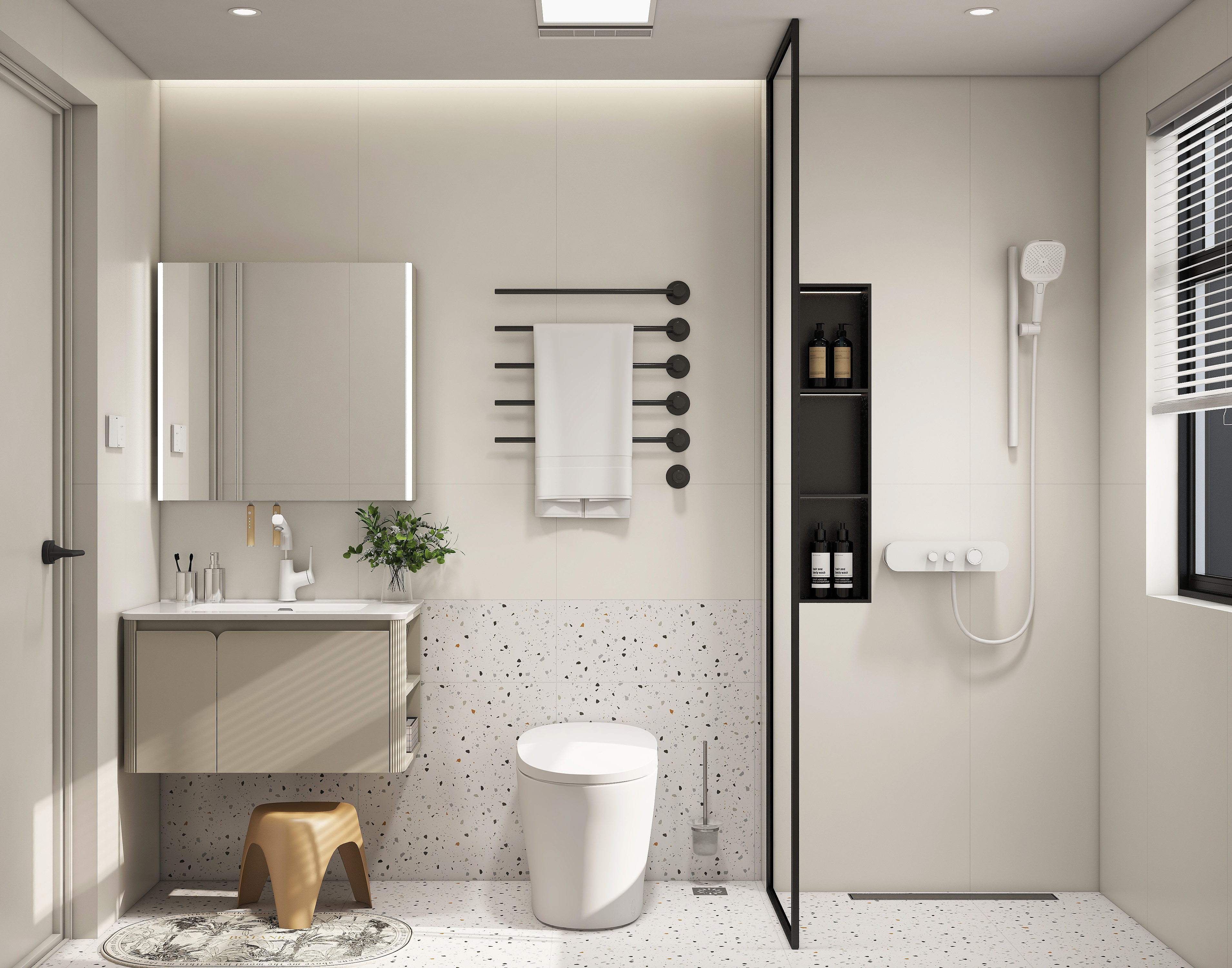 針對小戶型空間,瑞爾特全衛(wèi)煥新更擅長通過色彩延伸視覺邊界。玲瓏系列采用米白色抗菌釉面瓷磚鋪設墻面,其光滑表面對自然光的反射率較普通瓷磚大幅提升,配合局部木紋肌理的墻板,在低飽和度中注入自然暖意。這種色彩策略不僅符合色彩心理學中“柔和色調(diào)可降低焦慮感”的結(jié)論,更通過材質(zhì)肌理的對比,讓小空間在視覺上更顯通透輕盈。綠植的點綴則成為色彩敘事的點睛之筆,低飽和度的葉片與冷調(diào)墻面形成微妙平衡,恰如自然與人工的溫柔握手。