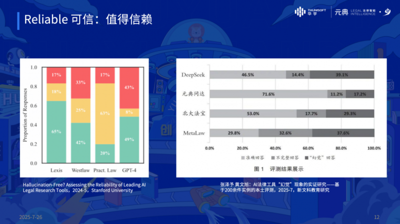 面對大模型浪潮,蔡建軍引用麥肯錫報告指出,未來 62% 的法律工作或可自動化。他認為,AI 對法律行業(yè)的變革不僅是效率提升(如要素式起訴書生成功能,每周服務數(shù)千用戶),更在于突破知識獲取邊界(如 “元典問達” 依托海量知識庫提供精準參考)、提升判斷一致性(如輔助合同審核、行政審批標準化)。而控制 AI “幻覺” 是關鍵 —— 華宇元典通過技術優(yōu)化,“元典問達”的幻覺率顯著優(yōu)于行業(yè)平均水平10-20個百分點,目標是將幻覺率控制在 5% 以內(nèi)。