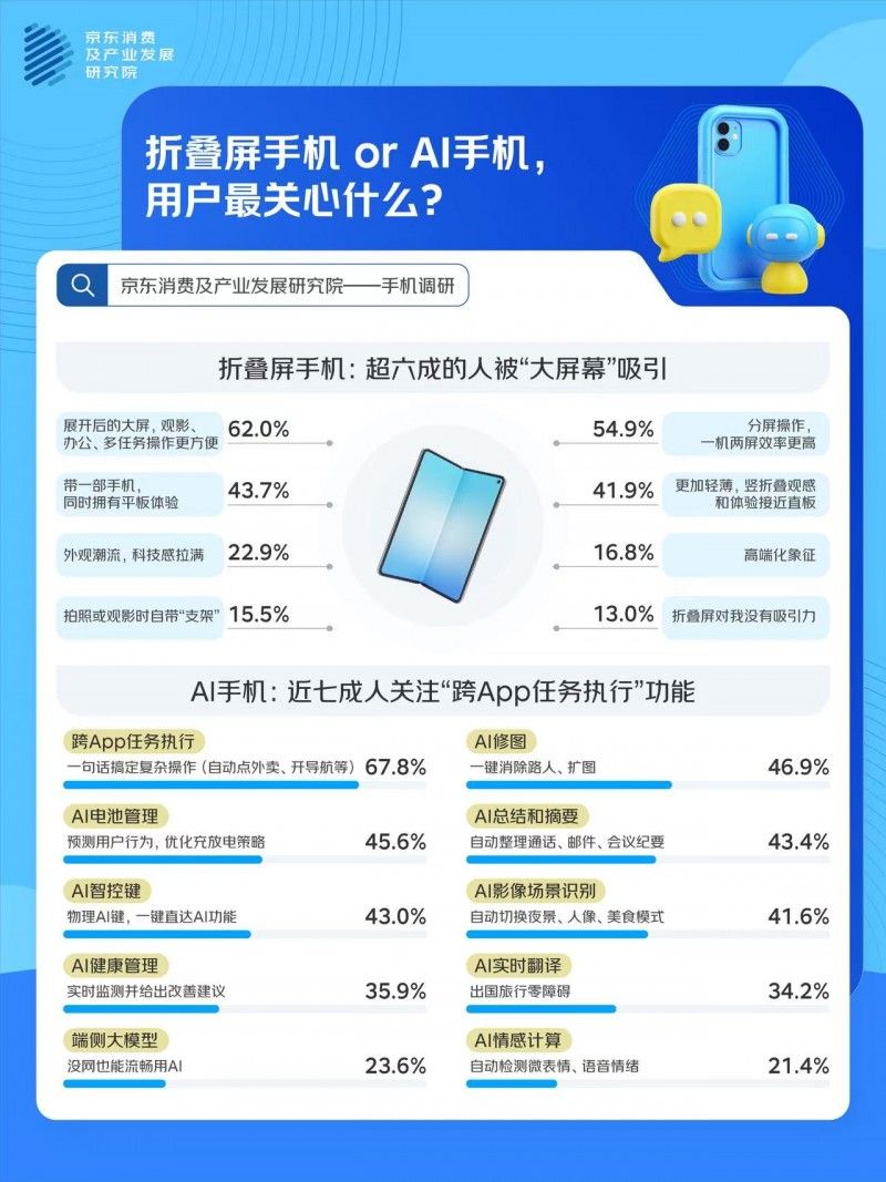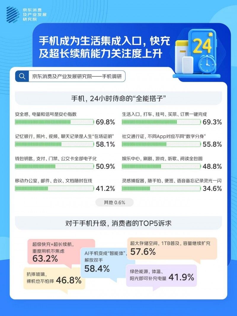 手機(jī)已經(jīng)從通訊工具成為了生活的集成入口,消費(fèi)者對(duì)手機(jī)功能的需求和選擇也在不斷發(fā)生變化,近日,京東消費(fèi)及產(chǎn)業(yè)發(fā)展研究院聯(lián)合京洞察發(fā)起調(diào)研,通過(guò)與1000位消費(fèi)者的對(duì)話,了解手機(jī)使用習(xí)慣變化、形態(tài)偏好、換新訴求及迭代期待,調(diào)研結(jié)果顯示: