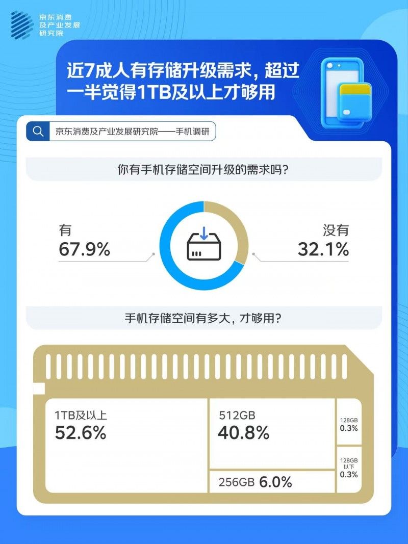 近七成用戶(hù)有手機(jī)存儲(chǔ)空間升級(jí)需求,超半數(shù)人覺(jué)得1TB及以上才夠用