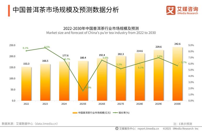 正是這一獨特特質(zhì),讓普洱茶在當(dāng)下的消費市場中持續(xù)煥發(fā)活力,呈現(xiàn)出穩(wěn)健增長的態(tài)勢。iiMedia Research(艾媒咨詢)數(shù)據(jù)顯示,2024年普洱茶市場規(guī)模已達177.6億元,預(yù)計到2030年將達242.6億元。這一增長勢頭的背后,既得益于消費升級背景下消費者健康意識的覺醒,人們愈發(fā)追求“越陳越香”所蘊含的養(yǎng)生價值,也離不開產(chǎn)業(yè)端在產(chǎn)品形態(tài)與渠道上的創(chuàng)新探索。