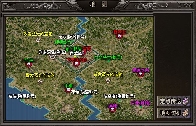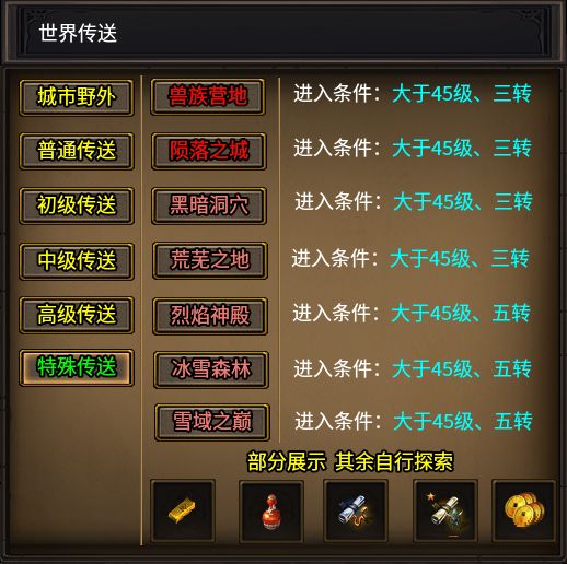 全服延續(xù)了完整的1.80復(fù)古玩法的世界架構(gòu),相對簡單,沒有復(fù)雜的多大陸設(shè)計。只要前往“比奇城”世界傳送陣處,即可隨意前往任意地圖,當(dāng)天進入也是有條件的,不同難度的副本地圖需達成對應(yīng)的等級、轉(zhuǎn)生條件。