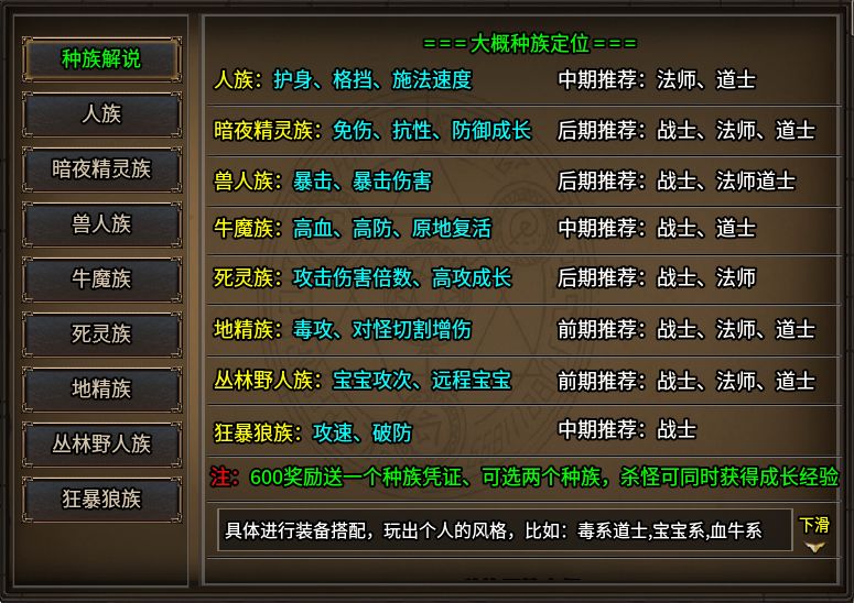 全服不單單只是傳奇三職業(yè)定位,它還加入了暗黑的種族體系,玩家創(chuàng)建角色進入游戲后,即可選擇。種族類型有八種,每個種族都有各自的特色定位,有擅長護身格擋的人族,也有強輸出暴擊的獸人族、也有擅長毒攻和切割的地精族等等。