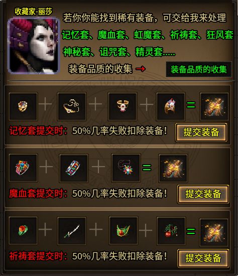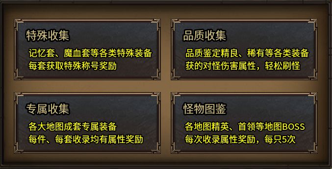 當(dāng)然,游戲內(nèi)本身就有非常多傳奇自有的裝備和怪物,加上暗黑專屬則更加豐富了,這些都在等待玩家一一探索和體驗。本服為了方便玩家逐一體驗和收集,特意做了非常完整的圖鑒系統(tǒng),包含特殊裝備收集、品質(zhì)裝備收集、暗黑專屬收集、和怪物圖鑒。每完成一個圖鑒都能大幅增加圖鑒屬性,成長效果杠杠的!絕對滿足玩家長線養(yǎng)成的沉浸式體驗需求。