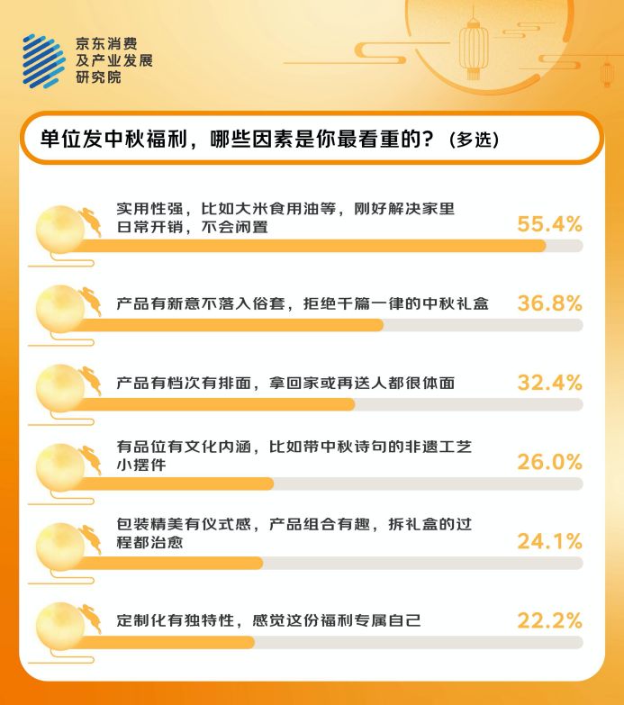 調(diào)研顯示,職場人對中秋福利的期待,既堅(jiān)持著實(shí)用至上的務(wù)實(shí)理念,也在向情感增值方向延伸。55.4%職場人將“實(shí)用性強(qiáng)”列為首要考量,米面糧油等日常剛需、數(shù)碼產(chǎn)品等實(shí)用好物成為高頻選擇。36.8%追求“產(chǎn)品有新意”,拒絕千篇一律的傳統(tǒng)禮盒,期待跨界聯(lián)名、創(chuàng)意設(shè)計(jì)等帶來的驚喜感。32.4%在意“產(chǎn)品有檔次”,希望福利兼具使用價值與情感認(rèn)同,拿回家能讓家人感受到企業(yè)關(guān)懷的溫度。