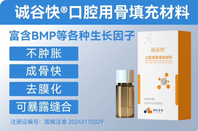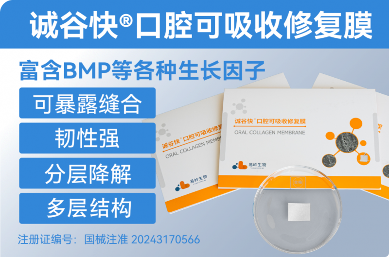 誠(chéng)谷快?口腔可吸收修復(fù)膜(韌性膠原膜),產(chǎn)品四大核心優(yōu)勢(shì):可暴露縫合、韌性強(qiáng)、分層降解(多層結(jié)構(gòu))、促成骨。作為易嶺生物專利技術(shù)的結(jié)晶(專利號(hào): ZL 2021 10090689.1),產(chǎn)品實(shí)現(xiàn)了從原料到成品的直接轉(zhuǎn)化:在保證屏障效果的同時(shí),易嶺生物在制作工藝上進(jìn)行了創(chuàng)新,研發(fā)出了直接利用動(dòng)物源生物膜制備的口腔修復(fù)膜及其制備方法,該方法直接對(duì)動(dòng)物源生物膜材料進(jìn)行一系列處理制備得到口腔修復(fù)膜材料,不使用任何交聯(lián)劑,創(chuàng)新清洗技術(shù),能夠大大減少生產(chǎn)操作流程,縮短生產(chǎn)周期,降低了患者的治療成本,讓更多患者可以受惠于科技成果。另外,誠(chéng)谷快?韌性膠原膜具有獨(dú)特的多層結(jié)構(gòu)設(shè)計(jì),能實(shí)現(xiàn)分層降解,具有長(zhǎng)達(dá)3個(gè)月的屏障作用,有效引導(dǎo)骨再生并防止軟組織長(zhǎng)入,且可完全降解,無需進(jìn)行二次手術(shù),解決了膜暴露可能引發(fā)的感染等并發(fā)癥這一臨床難題。