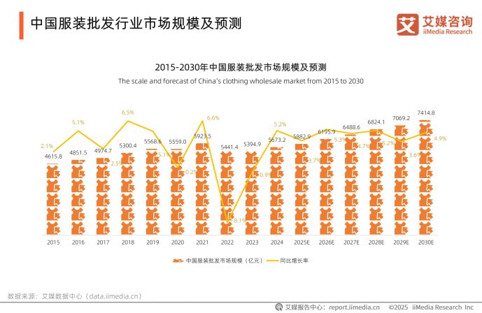 當下,服裝行業(yè)正迎來細分機遇。消費者需求的日趨多元推動企業(yè)深耕垂直賽道,加之國家提振消費專項行動、假期促銷與直播電商等新業(yè)態(tài)激活市場,居民衣著消費需求得以持續(xù)釋放,帶動服裝行業(yè)規(guī)模穩(wěn)步增長。iiMedia Research(艾媒咨詢)數據顯示,2024年中國服裝批發(fā)市場規(guī)模已達5673.2億元,同比增長5.2%,預計到2030年將進一步攀升至7414.8億元。